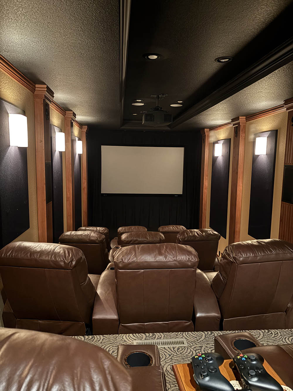 • Installation of three pairs of Klipsch PRO-160RPC speakers in the ceiling to implement Dolby Atmos technology. This addition transforms the traditional 7.1 channel setup into a fully immersive audio environment, allowing sound to move overhead and around the listener, creating a more lifelike and engaging experience.