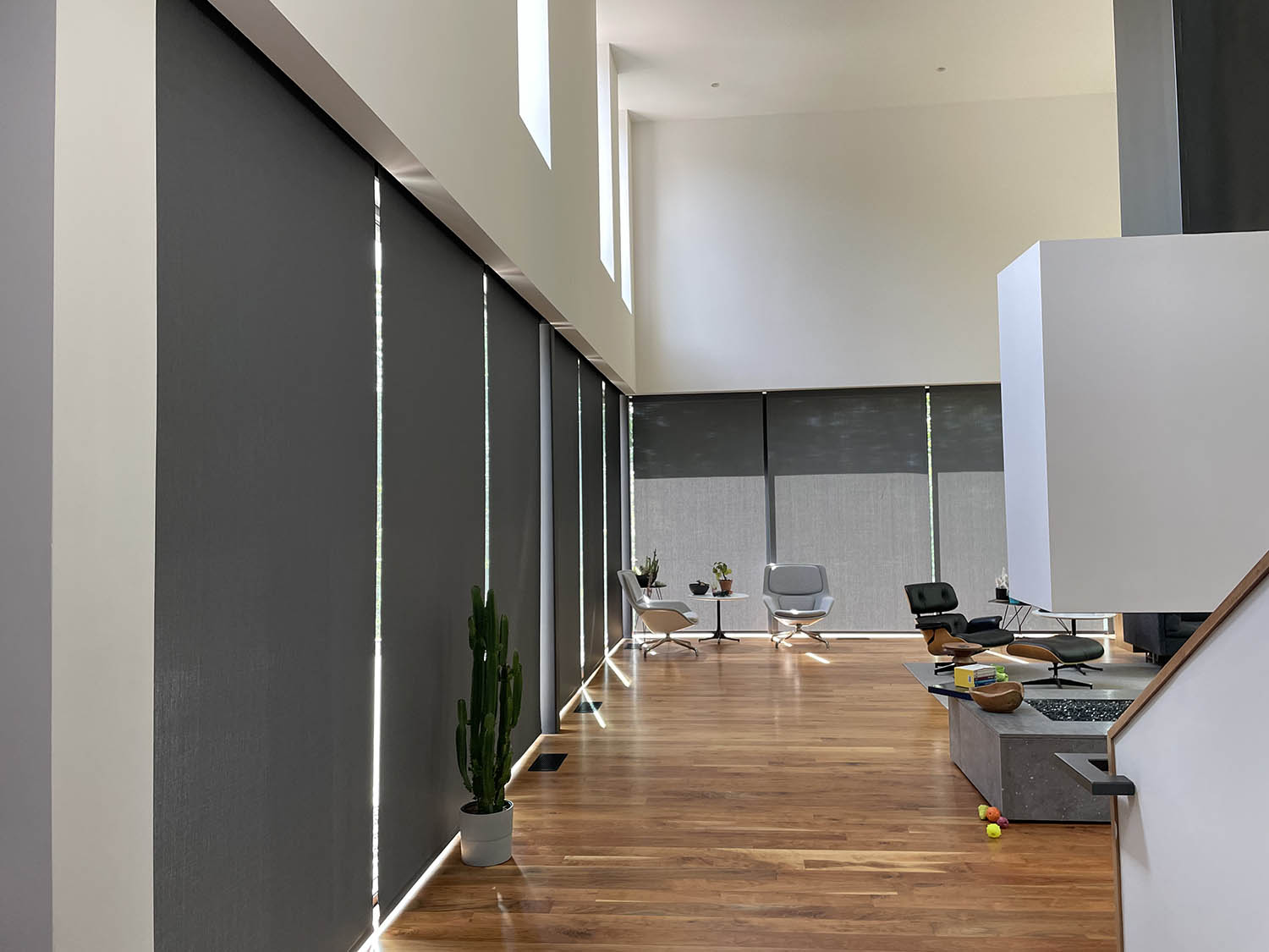 The homeowner chose a premium fabric with a 1% openness factor. This selection provides an ideal balance between allowing natural light into the space and maintaining privacy. Additionally, the low openness factor protects hardwood floors and furniture from the harsh afternoon sun, while still permitting a soft, ambient glow.
