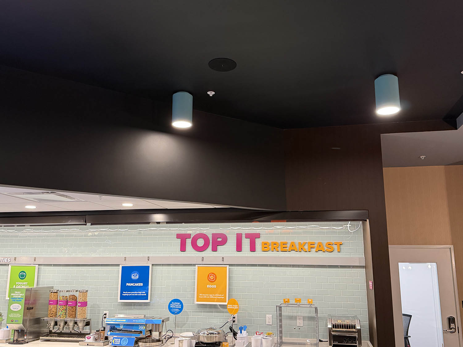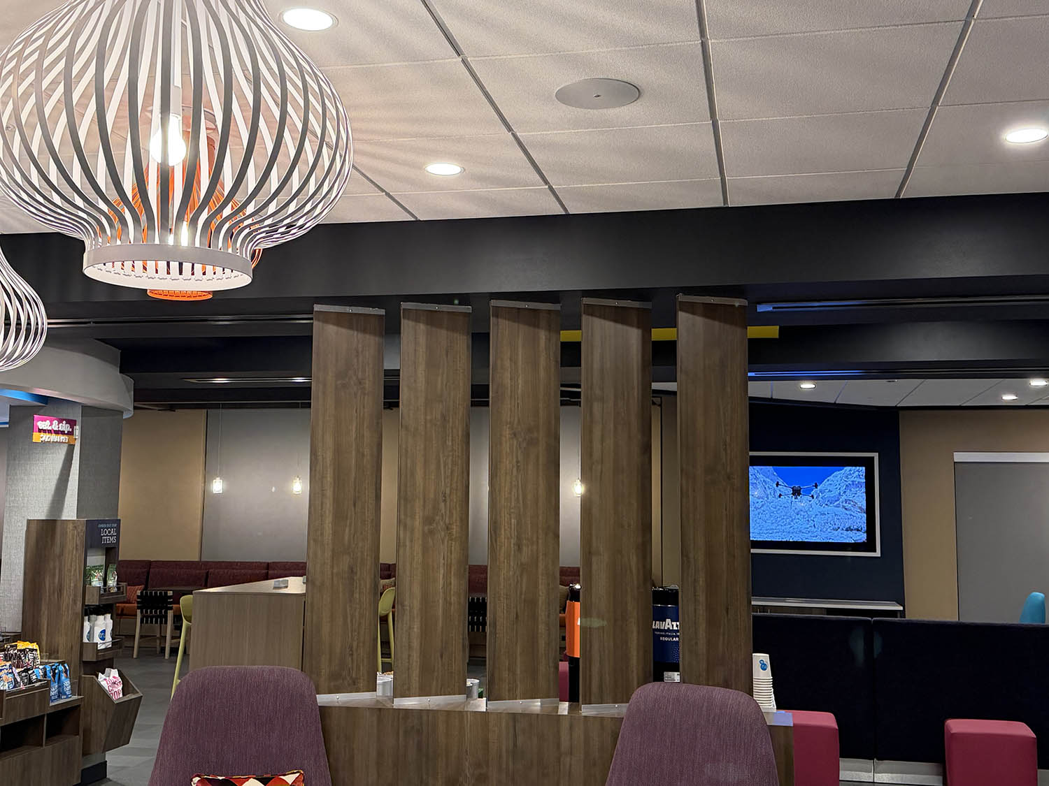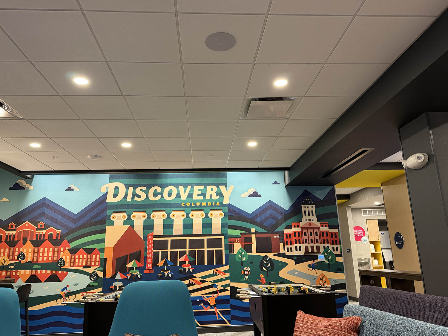 The hotel came to us two weeks prior to their grand opening asking for a background music system for the commons areas of the hotel. We installed flush mounted ceiling speakers in the lobby, restaurant, game room, lounge, fitness center, hallway, collaboration area, entry, and break room. Each zone has individual volume control from the two different wall controllers.