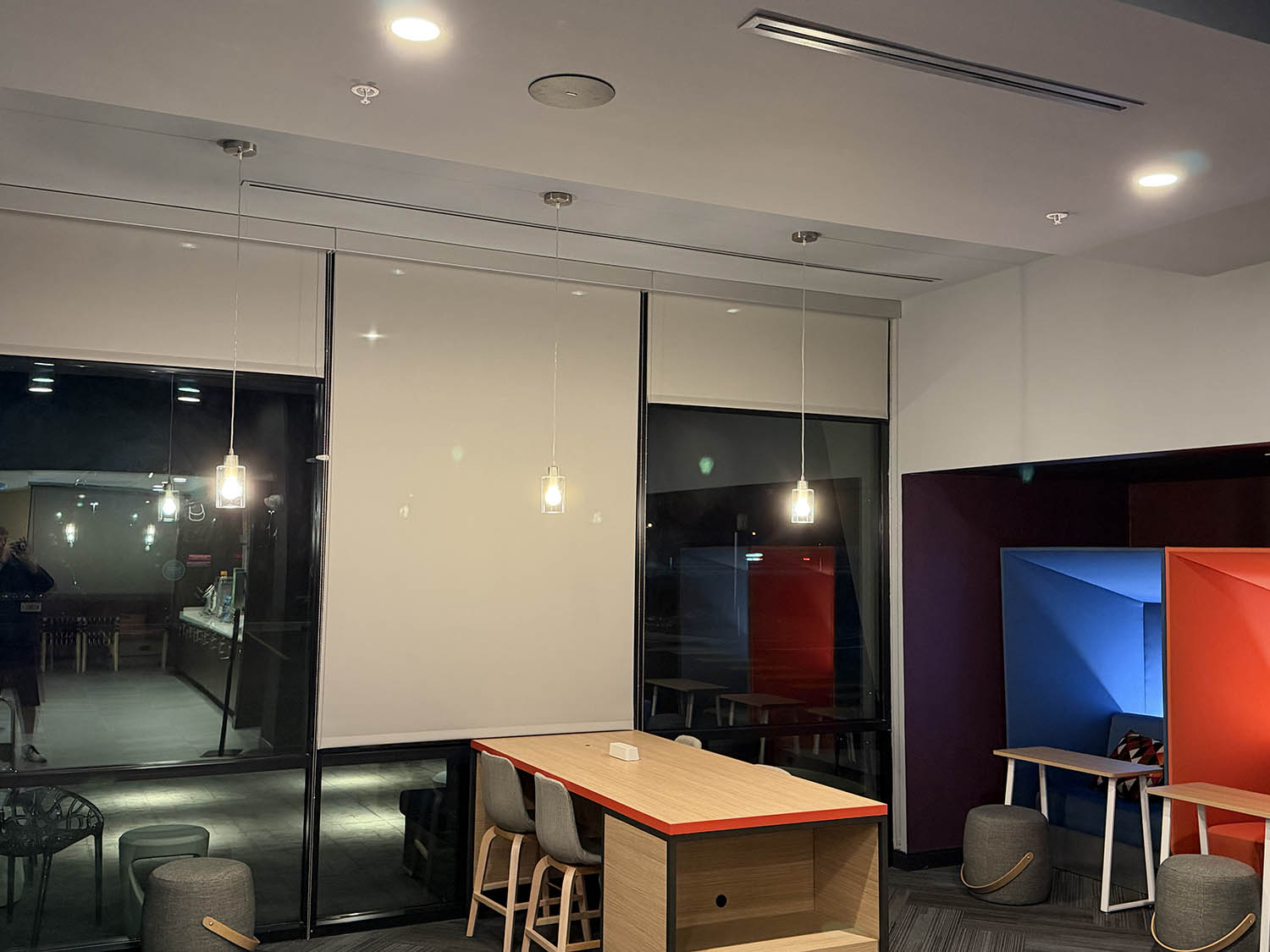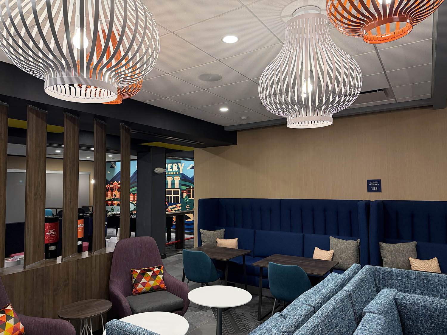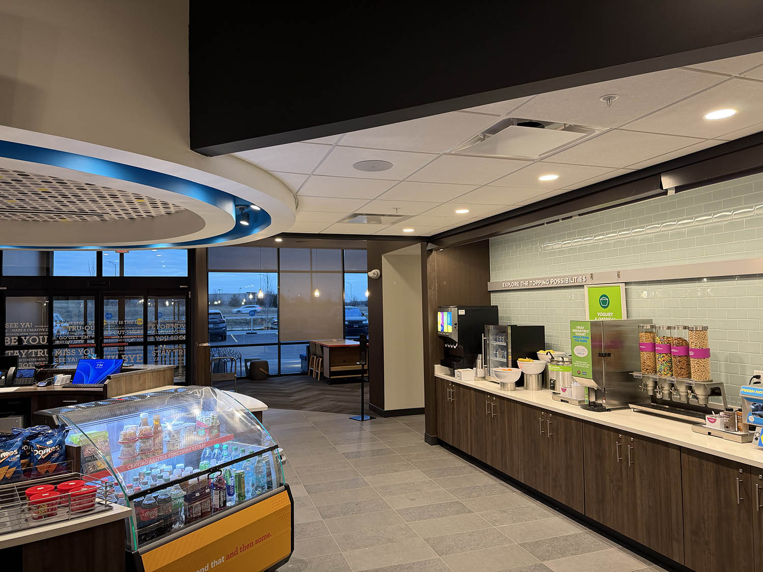 The hotel came to us two weeks prior to their grand opening asking for a background music system for the commons areas of the hotel. We installed flush mounted ceiling speakers in the lobby, restaurant, game room, lounge, fitness center, hallway, collaboration area, entry, and break room. Each zone has individual volume control from the two different wall controllers.